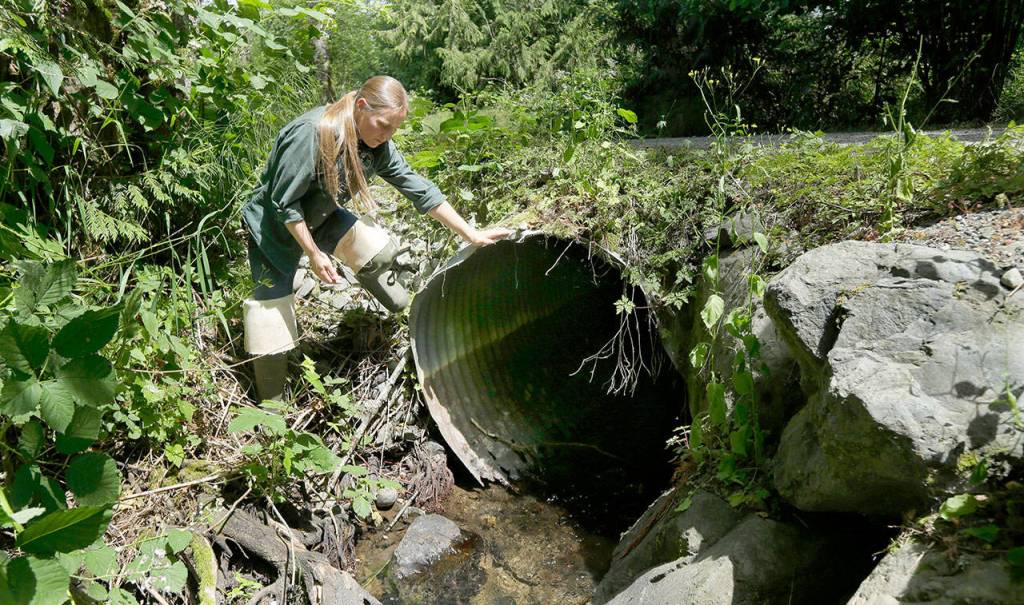 Melissa Erkel, a fish passage biologist with the Washington Department of Fish and Wildlife, looks at a culvert, a large pipe that allows streams to pass beneath roads but block migrating salmon, along the north fork of Newaukum Creek near Enumclaw. The Supreme Court is leaving in place a court order that forces Washington to restore salmon habitat by removing barriers that block fish migration. The justices divided 4-4 Monday in the long-running dispute that pits the state against Indian tribes and the federal government. (AP Photo/Ted S. Warren, file)