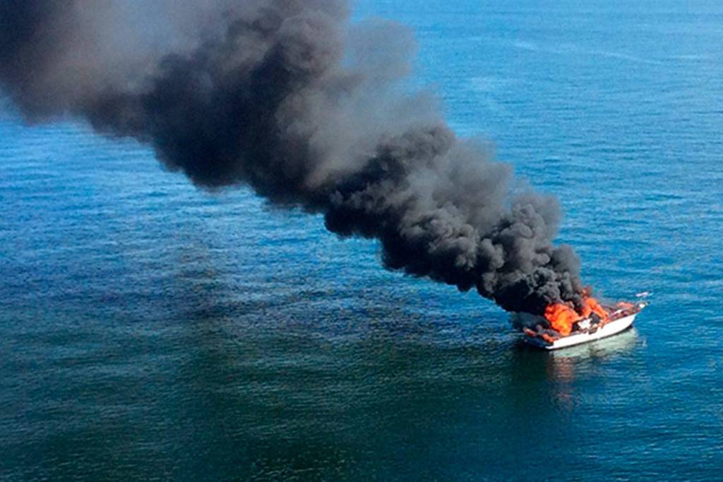 An MH-65 Dolphin helicopter crew from the Port Angeles Coast Guard station flew over the burning vessel and reported no visible sheen, Mosley said.