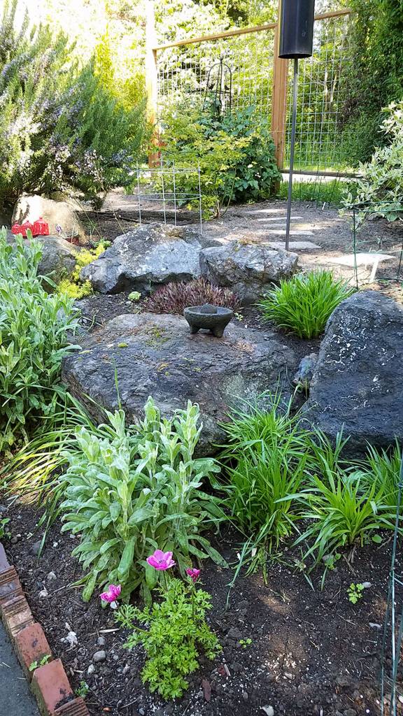 Also featured are armeria, lamium, stachys, kniphofia, verbascum, phlomis and anomotheca laxa with its bright red flowers. The colors attract pollinators and birds. Hidden in tall grasses is a rock serving as a water bowl for birds.