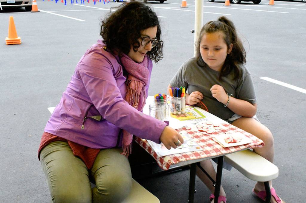 Jaxzen Berg, 7, of Port Townsend is a member of the POP Club and was playing Veggie Bingo at the market Wednesday. She was learning about different types of vegetables and their nutrition.