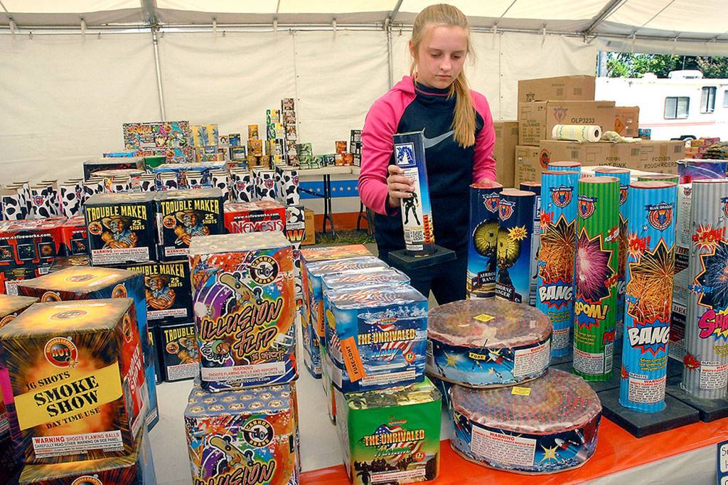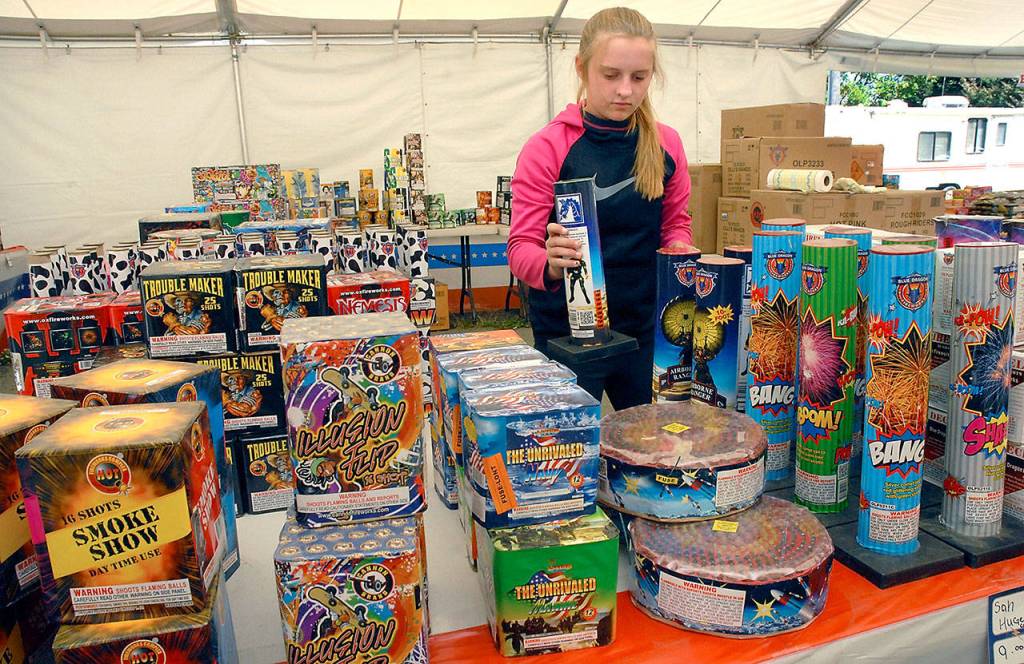 Kira Watson, 13, stocks tables of fireworks at the Olympus Fireworks stand on Tuesday at Gales Street and U.S. Highway 101 east of Port Angeles.