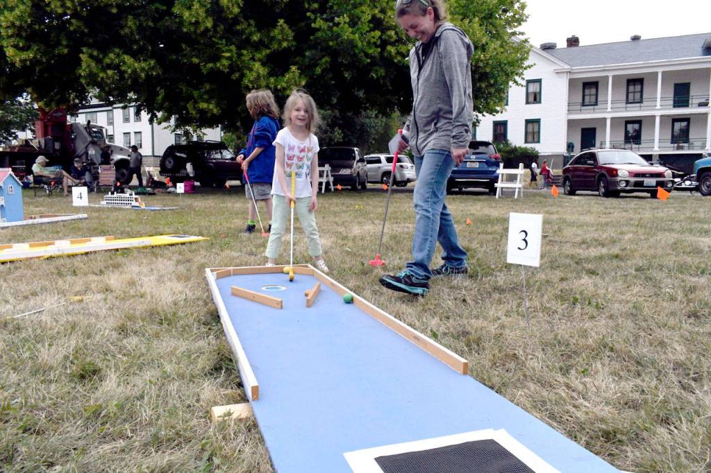 Bobbie McEachran teaches her daughter, 7-year old Teagan, to play mini-golf during the Old School Family 4th of July at For Worden’s parade grounds. Teagan was successful in her efforts. (Jeannie McMacken/ Peninsula Daily News)