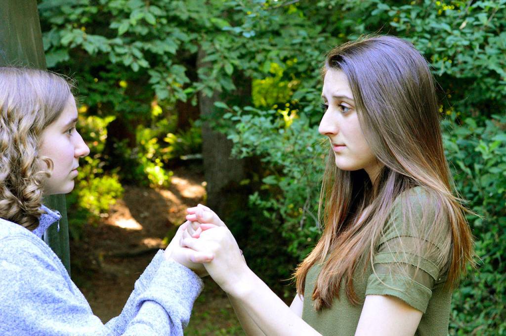 Celia (Sage Hunter), left, and Rosalind (Madelynne Jones) are cousins exiled to the Forest of Arden in “As You Like It,” the Shakespeare in the Woods production at the Port Angeles Fine Arts Center beginning Friday. (Diane Urbani de la Paz/for Peninsula Daily News)