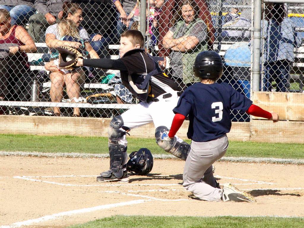 Dave Logan/for Peninsula Daily News The 21st annual Dick Brown Memorial Baseball Tournament began at the Lincoln Park fields in Port Angeles Saturday. Twenty teams from as far as Bellevue and Edmonds are competing. The two-day tournament winds up with the championship games in each division scheduled for 4 p.m. today. Here, Sequim Crosscutter catcher Brayden White gets the ball from the outfield, but not in time to stop Bryton Amsdill of the Port Angeles 12-year-olds from sliding home safely for the first run of the game.