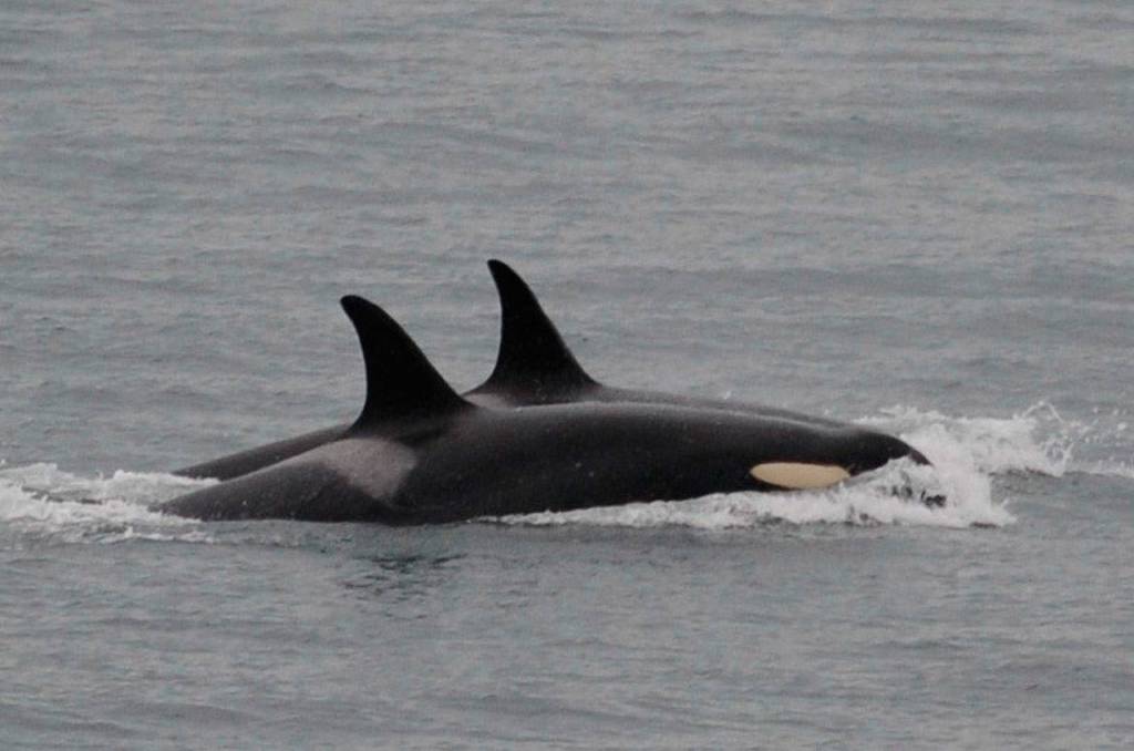 In this Saturday photo released by the Center for Whale Research, an orca known as J35, foreground, swims with other orcas near Friday Harbor. (Center for Whale Research via AP)