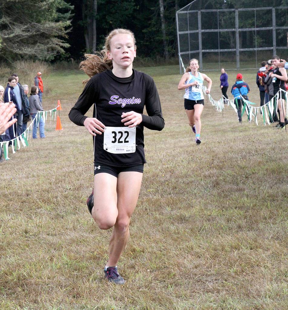 Lauren Larson, PA, first, 18:36.22; Riley Pyeatt, Sequim, second, 18:53.96; Kynzie DeLeon, PA, fourth, 19:27.73; Ella Holland, PA, 14th, 21:13.63; Madelyn Archibald, Forks, 15th, 21:16.18; Karen Ensastegui, Forks, 21st, 21:51.31; Kathryn Guttormsen, PA, 24th, 21:54.35; Jenna McGoff, PA, 25th, 21:56.69; Eleanor Byrne, Sequim, 26th, 22:00.32; Katie Cobb, PA, 28th, 22:20.94; Emma Weaver, PA, 32nd, 22:46.58; Jessica German, Sequim, 34th, 23:05.02; Aidyn Shingleton, Sequim, 38th, 23:26.98; Emily Silva, Sequim, 42nd, 23:48.44; Katelynn Glass, Sequim, 57th, 26:41.18; Lesae Pfeffer, Sequim 63rd, 29:06.27.