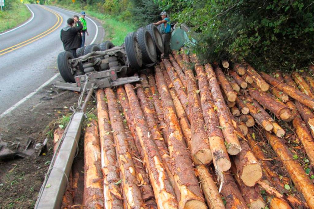 Charles D. Aslin, 44, of Port Angeles was traveling eastbound in a 1991 Freightliner when he attempted to negotiate a left curve and overturned near milepost 33, spilling logs onto the side of the highway, according to a State Patrol memo.