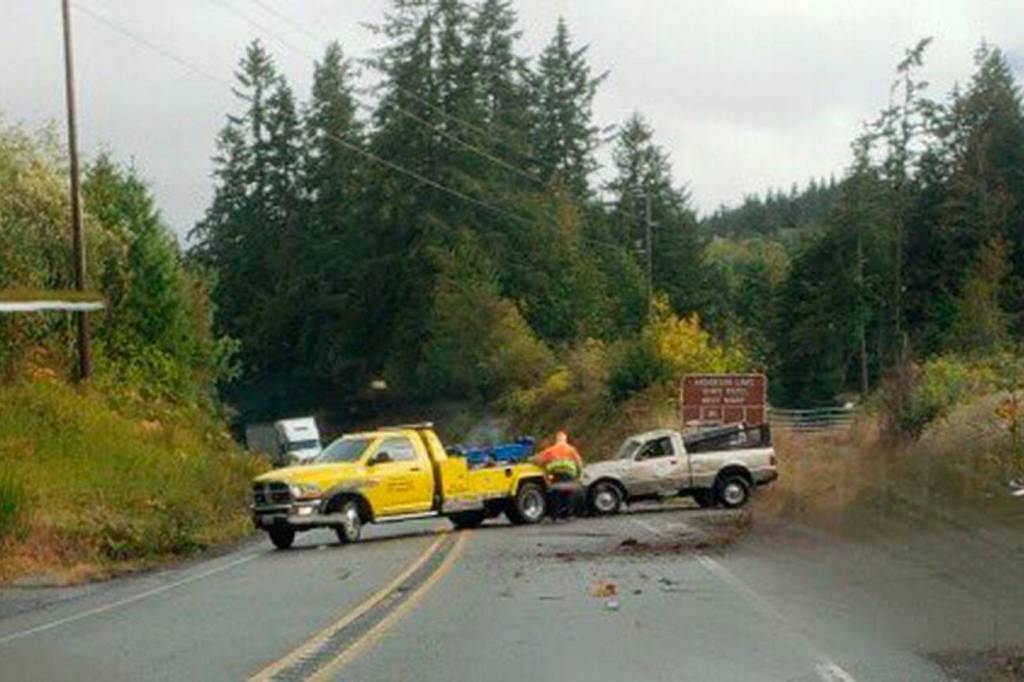 The truck rolled out of the ditch and landed in the eastbound land of Highway 20.