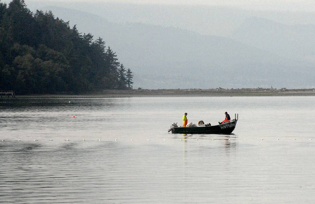 A fishing boat floats on the placid waters of Dungeness Bay after tending nets near Cline Spit on Tuesday north of Sequim.