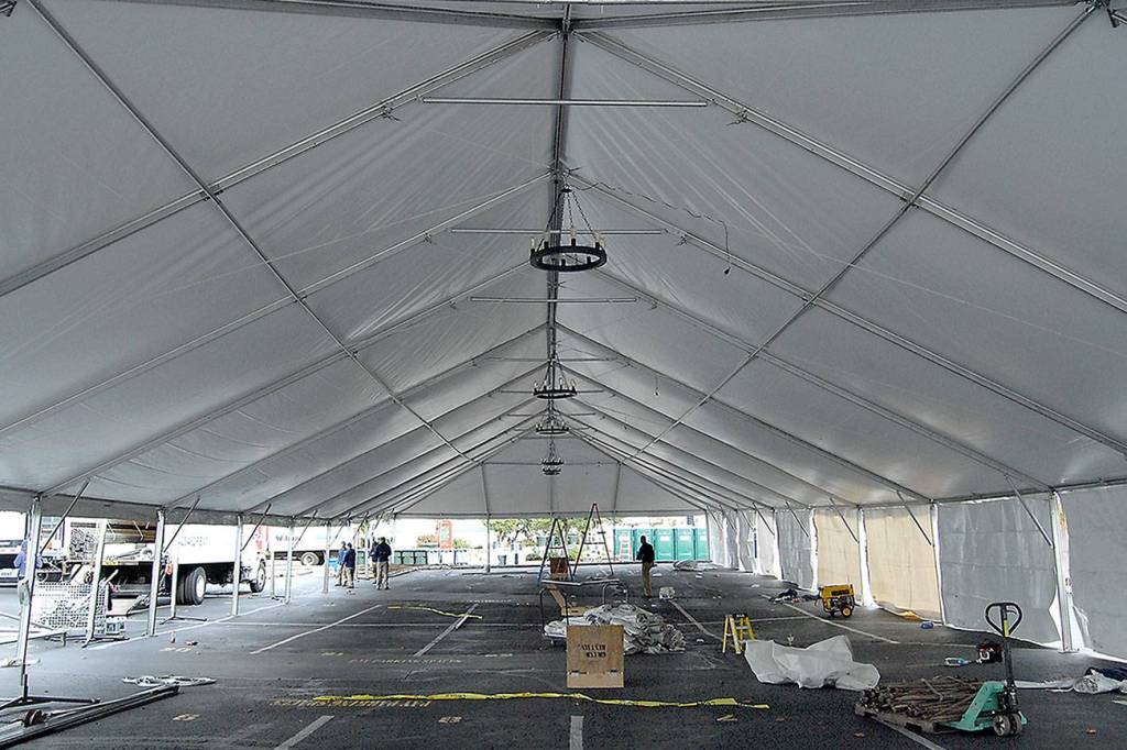 A crew from Bothel-based Grand Event Rentals works on assembling the main tent that will serve as the dining area for this weekend’s 17th annual Dungeness Crab & Seafood Festival in downtown Port Angeles. The three-day festival, which begins Friday, features food from 14 restaurants, live music, cooking demonstrations, a craft fair and a weekend crab derby as well as crab dinners for purchase.