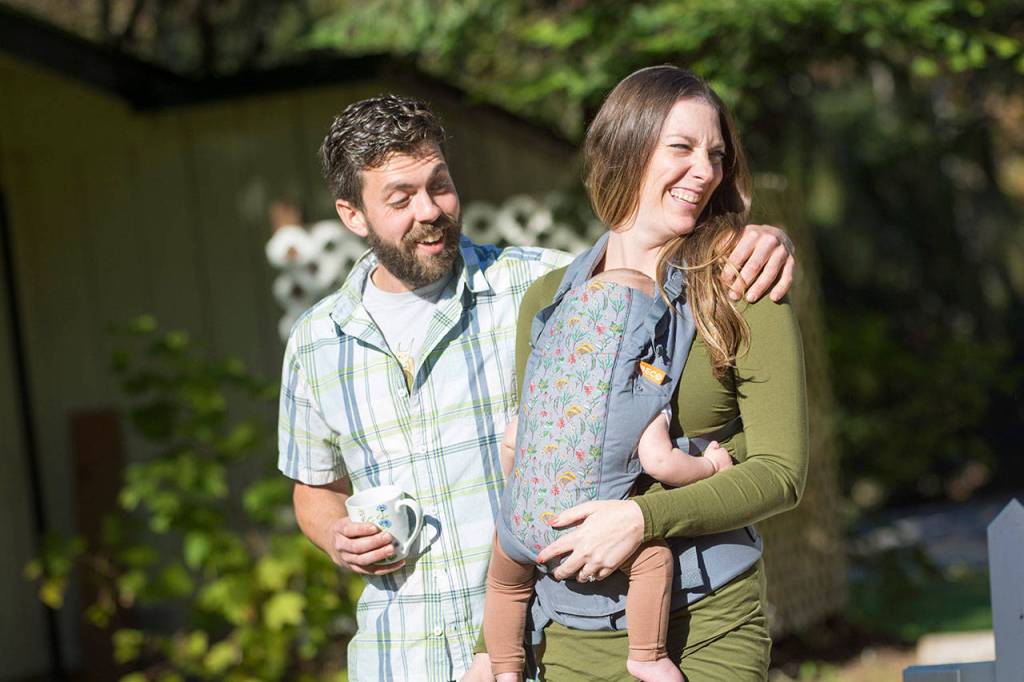 Troy Tamas and Angela Tamas holding baby Louie announce that Tim Pinson of Joyce is the new owner of Granny’s Cafe and the adjoining Indian Valley Motel on Sunday. (Jesse Major/Peninsula Daily News)