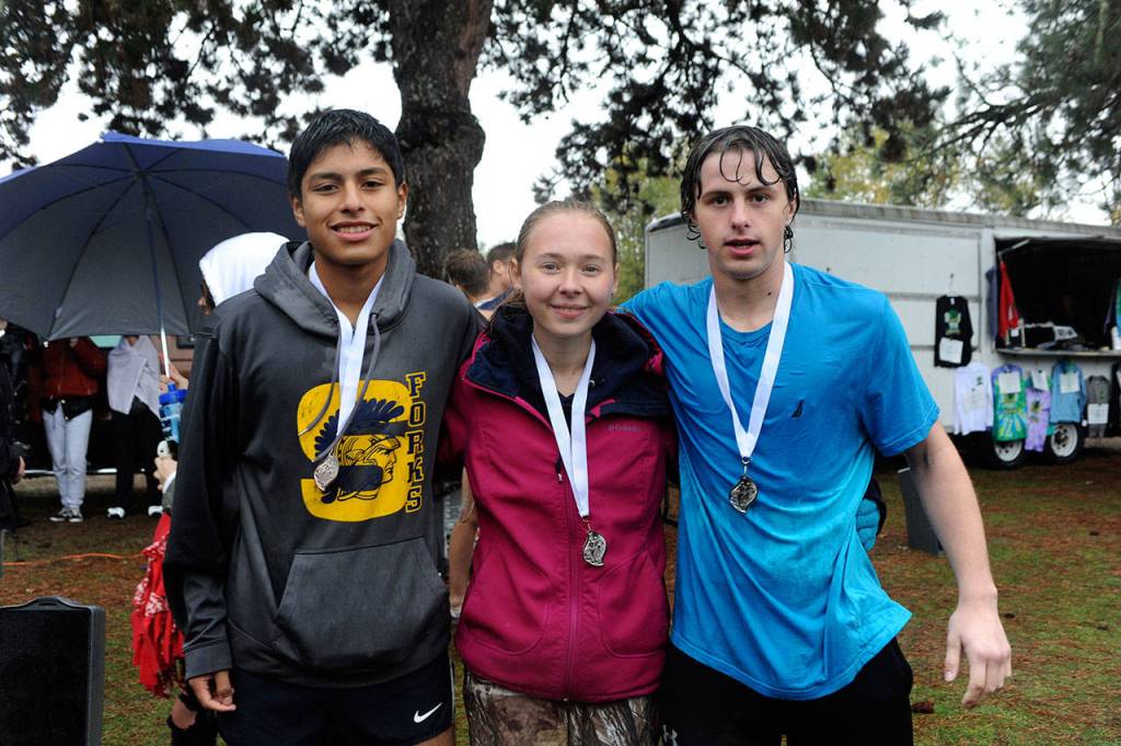 Lonnie Archibald/for Peninsula Daily News                                Three Forks cross-country runners, from left Wesley Camacho, Madelyn Archibald and Colton Duncan, all qualified at district at Woodland on Thursday for the state 1A cross-country meet to be held Saturday.