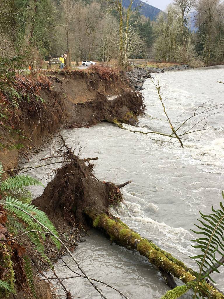 Heavy rains Monday and Tuesday led to flooding and river bank erosion on the Elwha River near the Madison Falls parking area on Olympic Hot Springs Road, said Penny Wagner, park spokeswoman.
