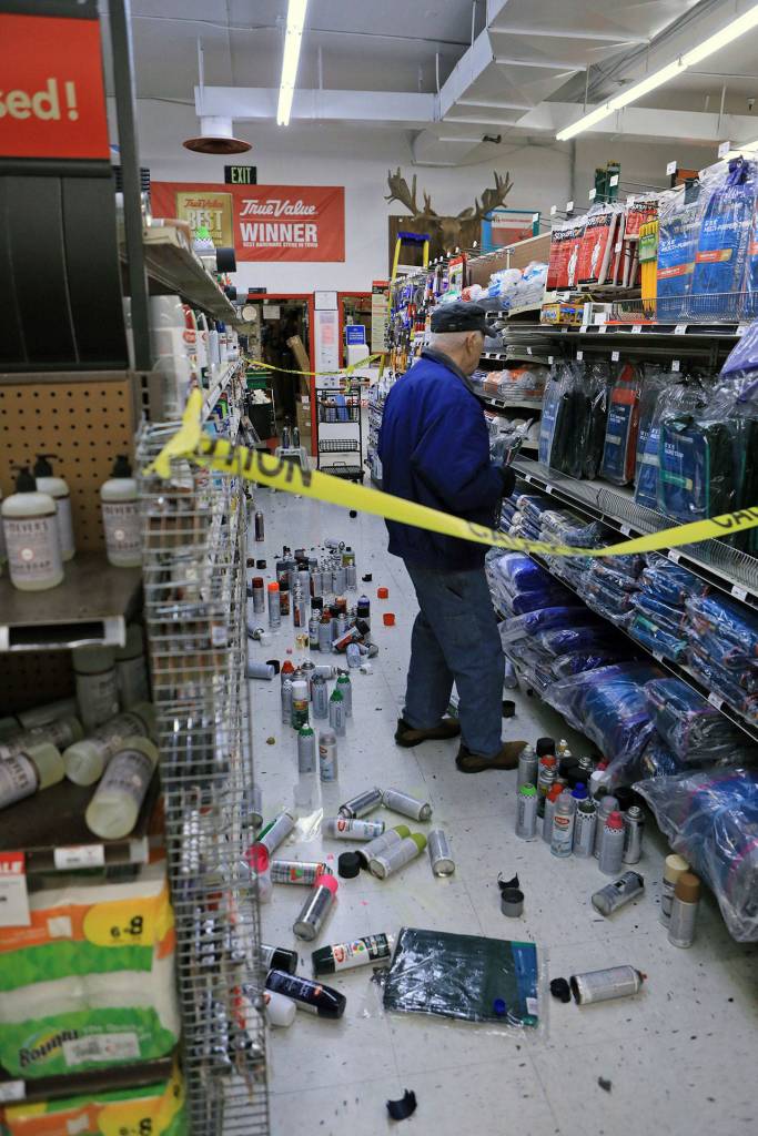 Cereal boxes and packages of batteries littered the floor of a grocery store, and picture frames and mirrors were knocked from living room walls.