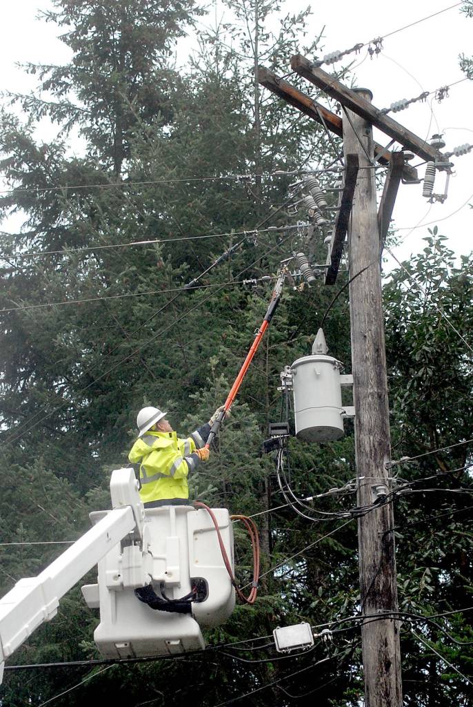 Clallam County PUD line worker Richard Christiansen works to isolate a damaged power circuit at Gasman Road at Northwood Lane that left customers in The Bluffs neighborhood east of Port Angeles without power on Thursday. (Keith Thorpe/Peninsula Daily News)