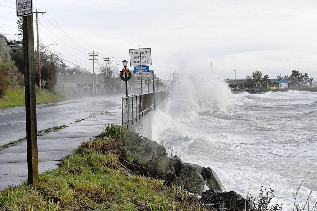 Storm-driven waves battered the sea wall and washed over Sims Way by the ferry terminal Thursday in Port Townsend (Jeannie McMacken/Peninsula Daily News)