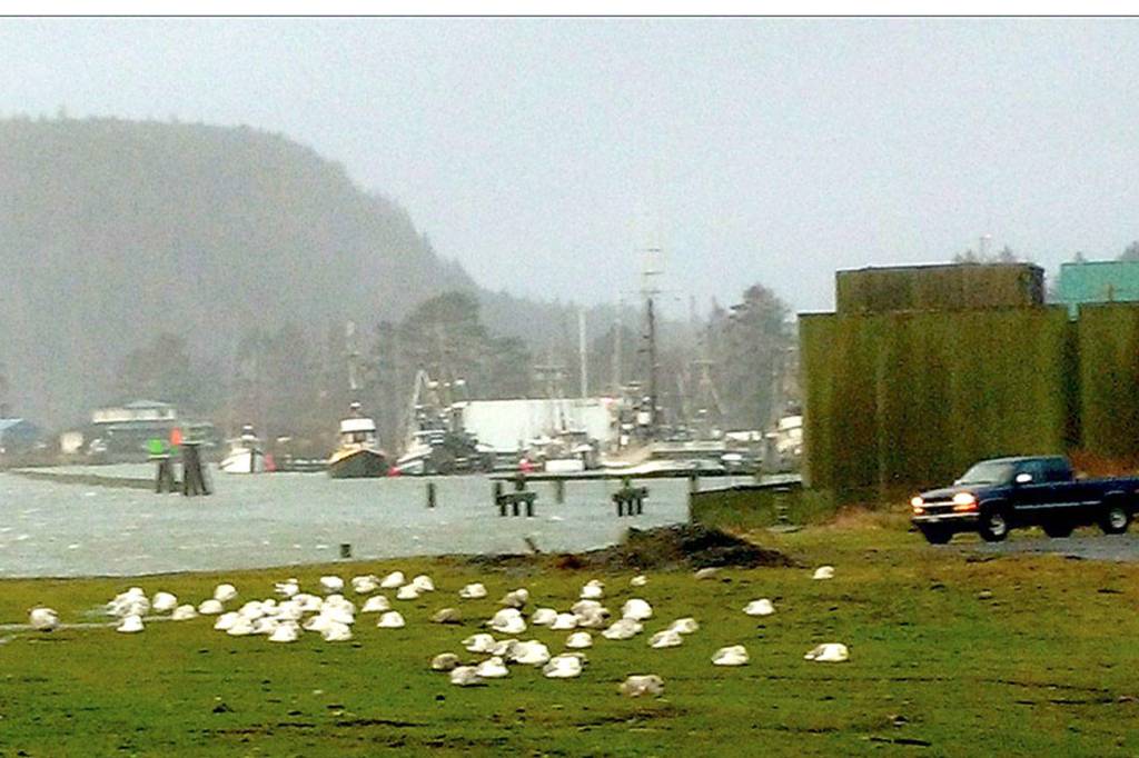 I fairly chuckled as a man chased after his hat until it became waterlogged in a big puddle. The seagulls here were rocking on the churning Quileute River or clinging to a patch of grass, streamlining their bodies to blend with the earth and their bills into the wind.