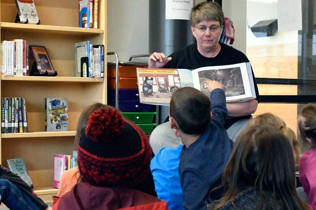 Salish Coast Elementary first-grade students eagerly respond to a story read by librarian/STEM teacher Denise Aeden. (Jeannie McMacken/Peninsula Daily News)