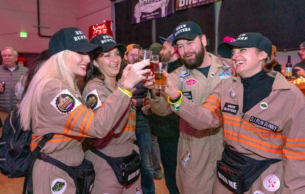 PORT TOWNSEND — A group of friends from Seattle, from left, Bethany Burkheart, Olivia Gronz and husband John, and Amanda Barnett, raised their glasses in a toast for another year at the 15th Strange Brewfest on Friday. The friends are spent their sixth year at the annual two-day event in downtown Port Townsend.