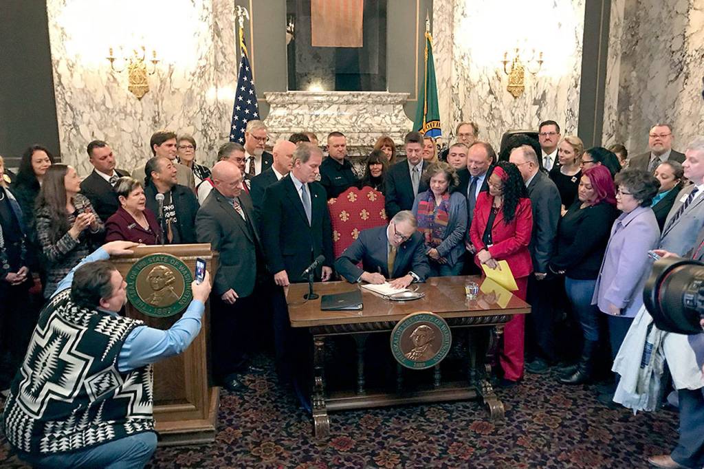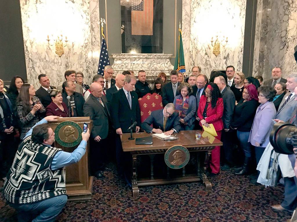 Gov. Jay Inslee signs the first bill of the 2019 legislative session at a ceremony in the State Reception Room on Monday.