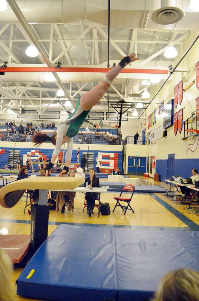 Jackie Mangano                                Port Angeles’ Aiesha LaTourette competes on the vault during the Class 2A/3A West Central District Gymnastics meet at Kent-Meridian High School. LaTourette will compete at the state gymnastics meet at Sammamish High School on Thursday and Friday.