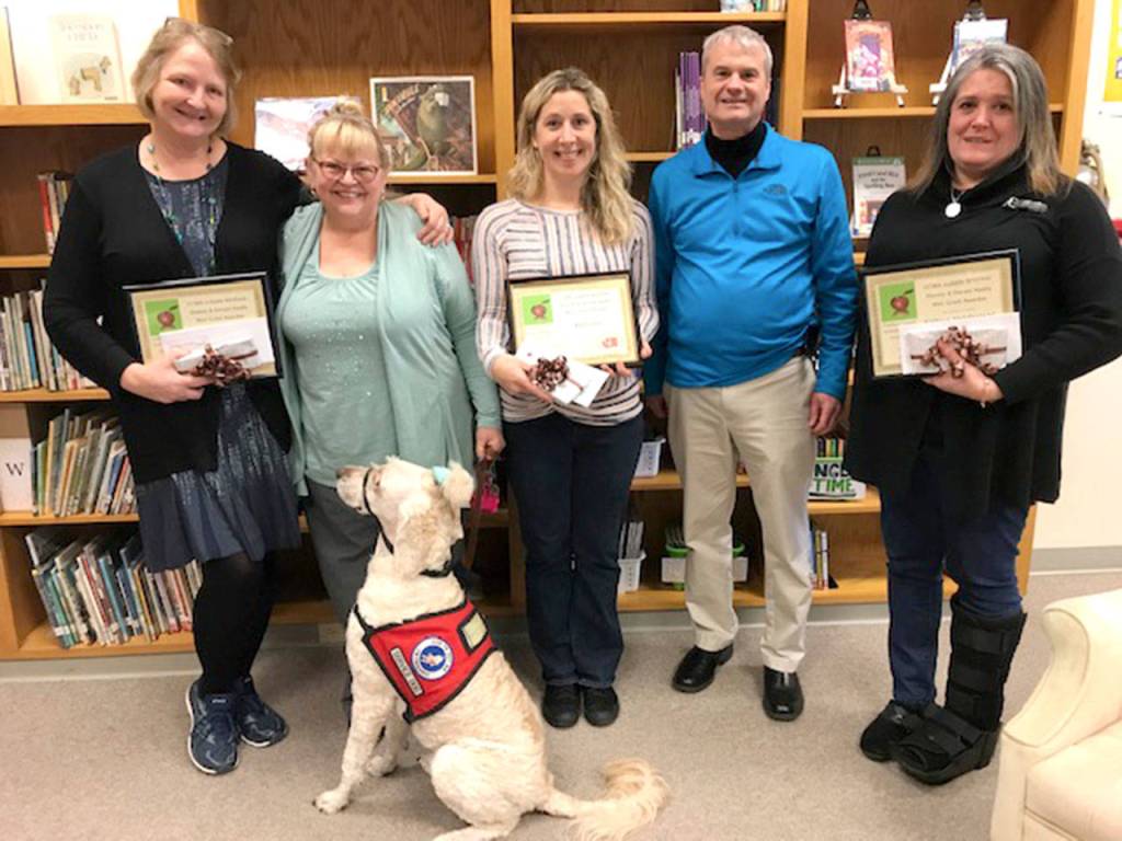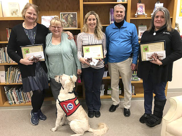 Crescent School District grant awardees, from left, are teacher Nancy McHenry, board President Lora Brabant, teacher Barb Silva, Superintendent Dave Bingham and teacher Kathryn Middlestead. In front is service dog Daisy.