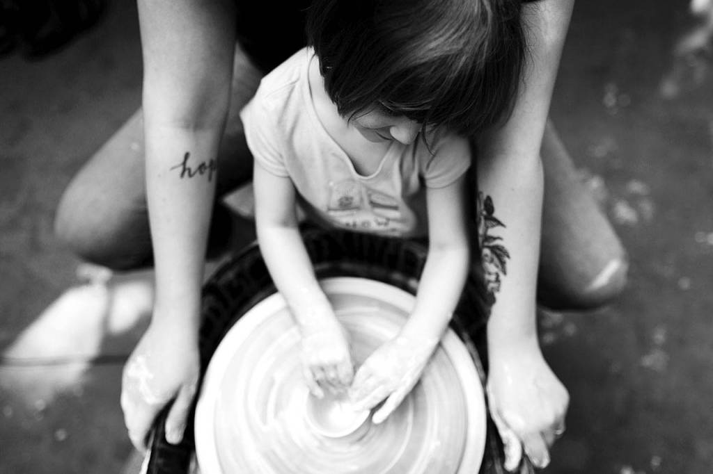In one photograph, an infant watches as her mom’s feet extend en pointe. In another, liquid clay flows around a child’s hands; in yet another a writer gazes into the distance while her daughter sits beside her.