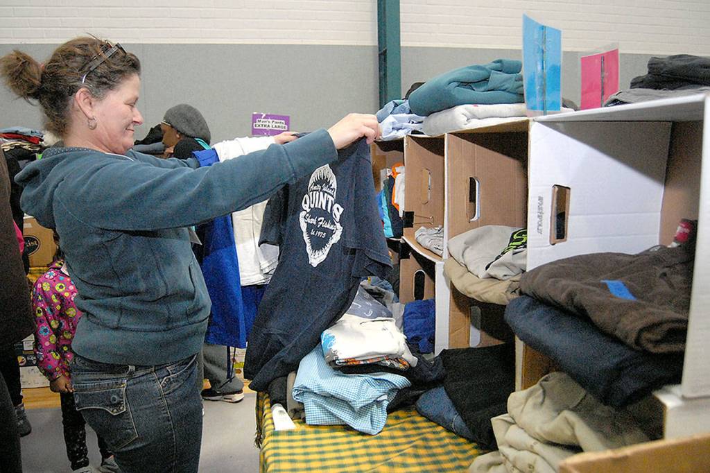 Mary Mann, who lives at Oxford House transitional housing in Port Angeles, looks over free clothing available to attendees of Friday’s 2019 Clallam County Project Homeless Connect at Vern Burton Community Center in Port Angeles.