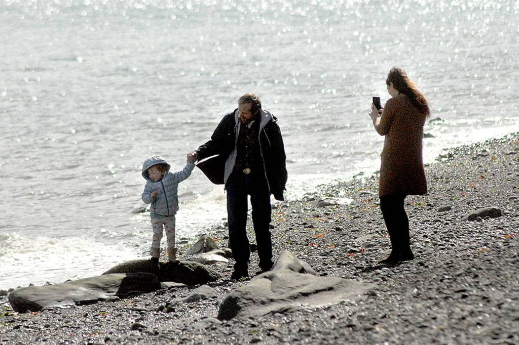 Kirk Peterson of Port Angeles, center, holds the hand of his great-granddaughter, Ella Holland, 2½, as his granddaughter, Sheena Peterson of Port Angeles, right, takes a photo with a cellphone during an outing Tuesday along the beach at Marlyn Nelson County Park at Port Williams near Sequim. Temperatures reached into the mid-40s across much of the North Olympic Peninsula on Tuesday with warmer conditions expected by weekend as the winter season nears its end. Spring officially begins at 2:58 p.m. March 20. For the full five-day forecast, see Page B6.