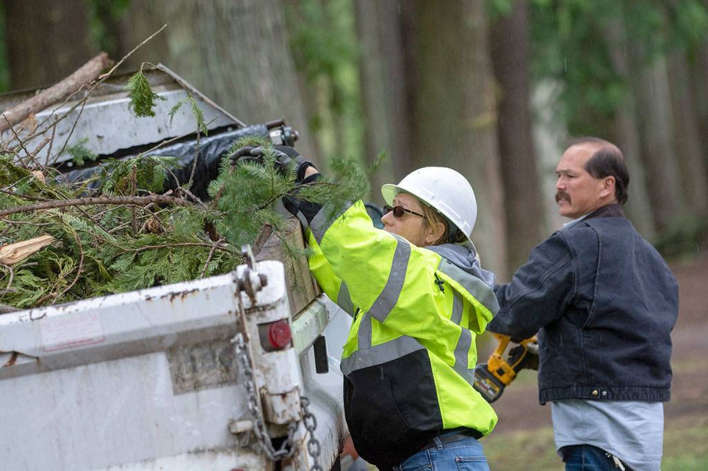 PORT ANGELES — Brooke Keohokalole and Leon Leonard, maintenance workers with the city of Port Angeles Parks and Recreation Department, clear debris from Lincoln Park on Monday.