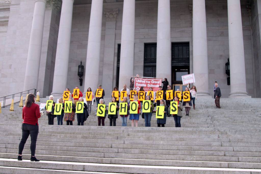 OLYMPIA — Seattle Public School librarians gathered on the steps of the Capitol building to protest the lack of funding for schools and their libraries.