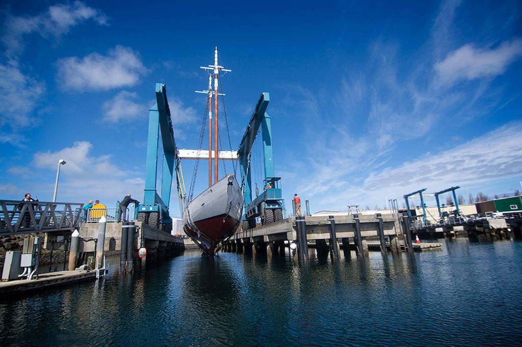Dozens of people watched the historic 133-foot vessel as it made its way across the Port Townsend Boat Haven hanging from a 300-ton travel lift Friday morning before being lowered into the water.
