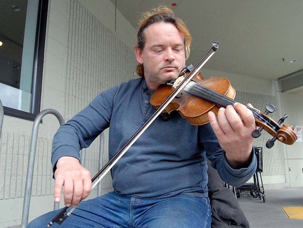 PHOTO: Port Townsend busker fiddles for funds in Sequim