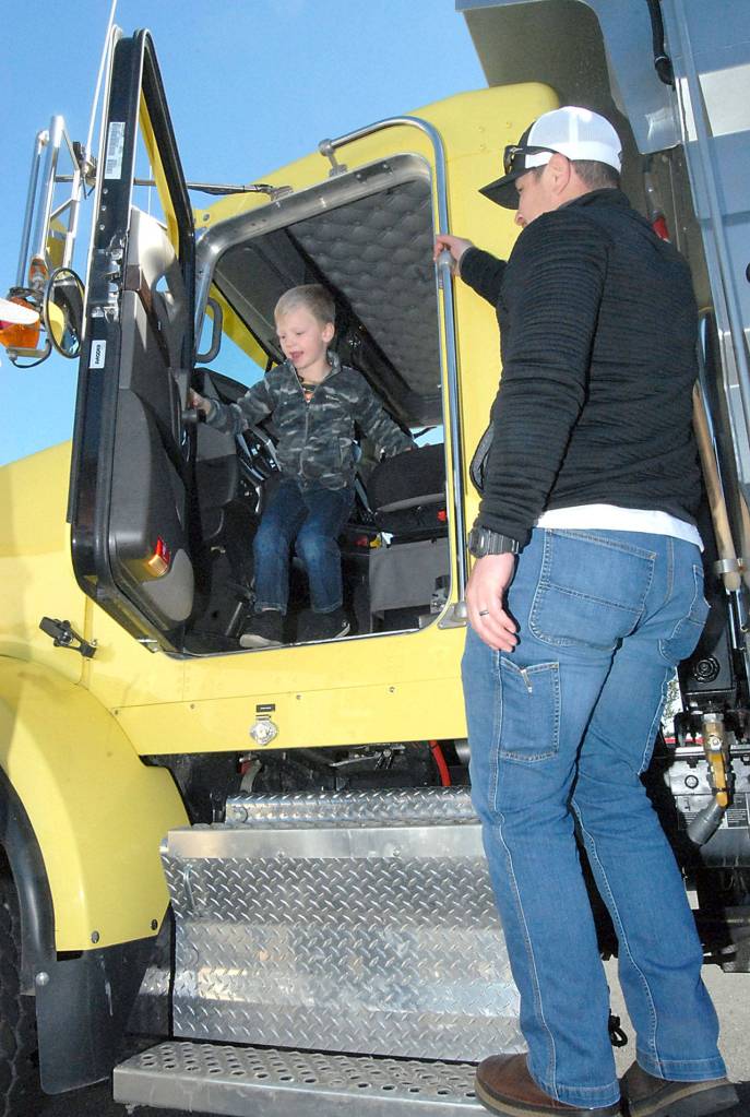 PORT ANGELES — Four-year-old Makai Hapoff of Port Angeles rides a wheelchair lift operated by Clallam Transit driver Pete Sekac during Saturday’s Touch a Truck at Queen of Angels School in Port Angeles. The event, which was hosted by the school, brought in a variety of large trucks, heavy machinery and other vehicles for children to examine and climb aboard. In the second photo, Levi Adolphe, 4, of Port Angeles stands in the cab of dump truck belonging to Clallam County as Port Angeles road department driver Devin Scott stands by to assist.