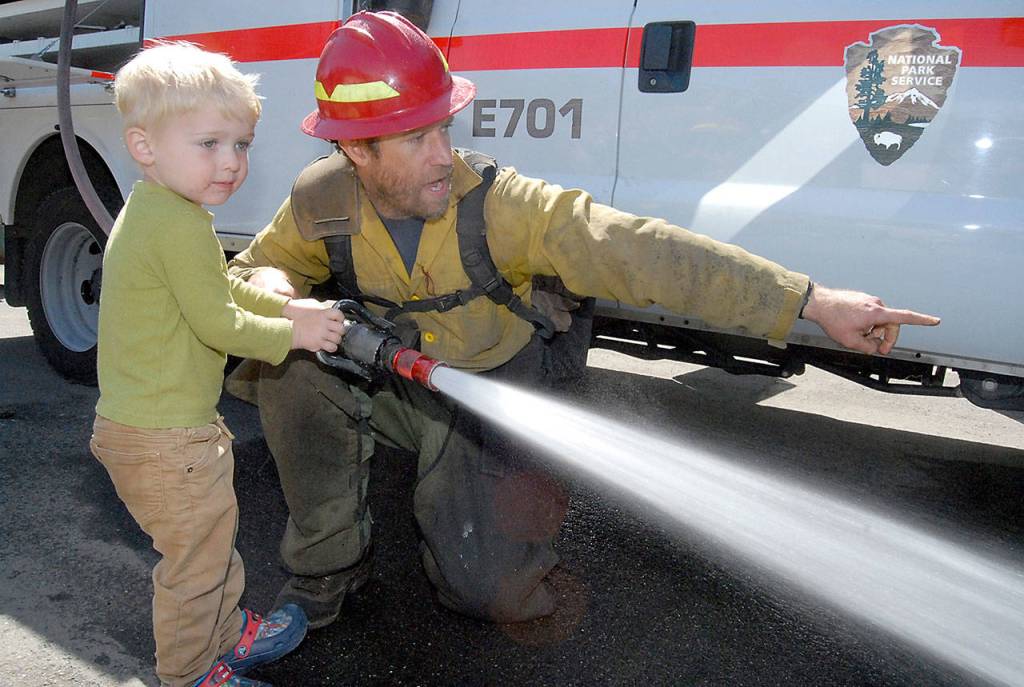 Above, Olympic National Park firefighter Paul Staley directs 3-year-old Owen Bailey of Gig Harbor where to point a fire hose as part of Junior Ranger Day on Saturday at the park’s Port Angeles visitor center. The park provided a variety of displays, activities and demonstrations to promote nature and the wilderness experience. At left, 4-year-old Jennifer Sun of Seattle feeds a piece of carrot to Sox, a backcountry mule, as Olympic National Park animal caretaker Heidi Brill looks on.