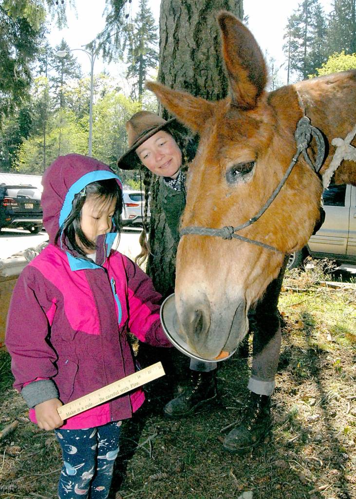 Four-year-old Jennifer Sun of Seattle feeds a piece of carrot to Sox, a backcountry mule, as Olympic National Park animal caretaker Heidi Brill looks on as part of Junior Ranger Day on Saturday at the park’s Port Angeles visitor center. (Keith Thorpe/Peninsula Daily News)