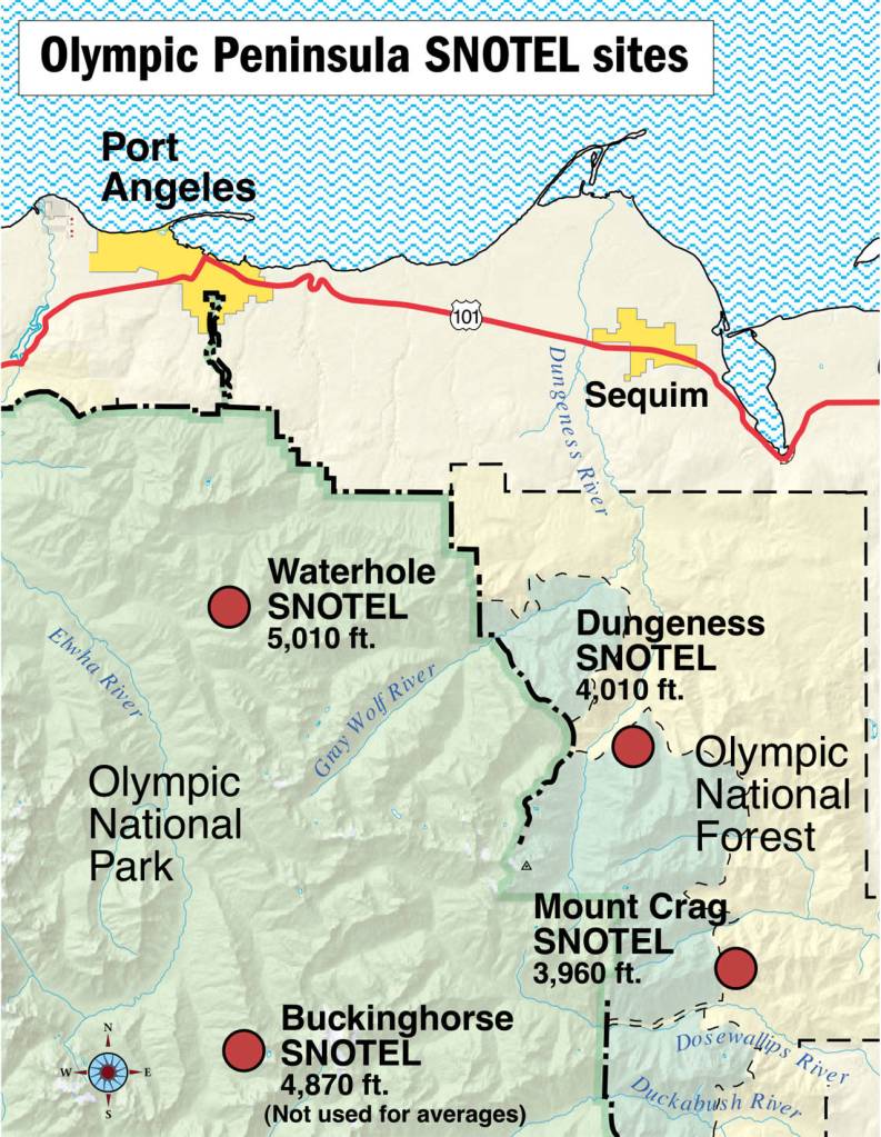 Daily snowpack averages are taken at three USDA snow telemetry (SNOTEL) sites in the Olympic Mountains: Waterhole, Dungeness and Mount Crag.