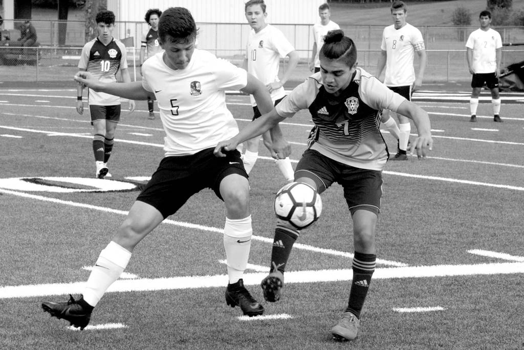 Forks’ Hugo Sandoval, right, controls the ball against Klahowya’s Logan Brunson during Tuesday’s Class 1A state soccer tournament game at Spartan Stadium.