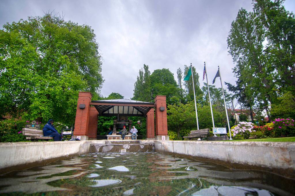 People sit under cover at Veterans Memorial Park in Port Angeles during a light rain. (Jesse Major/Peninsula Daily News)