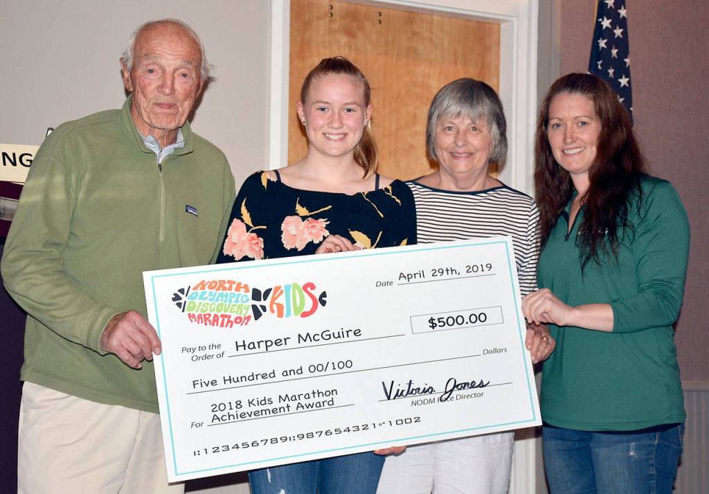 From left, Gene Turner, Harper McGuire, Norma Turner and Victoria Jones, North Olympic Discovery Marathon race director. (Harper McGuire Photo/Courtesy of PASD)