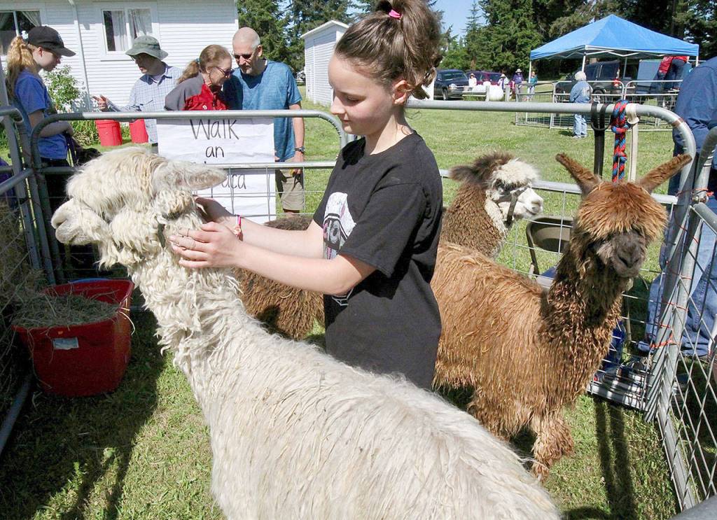 Kelcie Blore of Port Angeles pets one of the alpacas on display this year at the Shepherd’s Festival. The 38th annual festival drew a large crowd Monday at Macleay Hall near Sequim. The hall was full of vendors with wool and related products, including lamb kabobs, while outside featured a petting area for kids and sheep shearing.