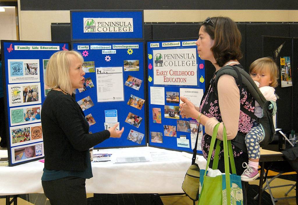 Kaylee Cammack, Family Life Education program coordinator for Peninsula College, left, speaks with Harmony Rutter of Sequim with her daughter, Felicity Parrish, during Discover Peninsula College Day on the school’s Port Angeles campus. Wednesday’s event allowed potential students and interested adults to learn about educational opportunities provided by the school and a chance to speak with counselors and educational program representatives.
