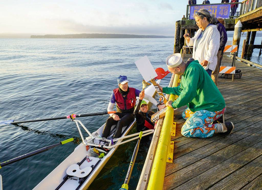 Ken Deem of Tacoma was the first solo racer to reach the Seventy48 finish line. Under the name Wave Forager, he rowed in two minutes before 6 a.m. Standing barefoot on the wooden dock — reconnecting to land after nearly 11 hours in his scull — he wore a blanket like a scarf around his shoulders.