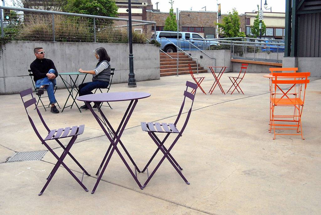 Port Angeles Parks and Recreation Department Director Corey Delikat, left, and Mayor Sissi Bruch sit at one of six cafe table sets deployed by the city at the pavillion at The Gateway in downtown Port Angeles recently. Bruch said The Gateway had always lacked public seating and the table sets were acquired to provide a more pleasant public environment. Delikat said more chairs and tables were possible in the future.