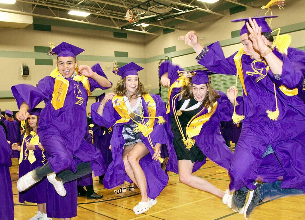 SEQUIM — Just before the march into the football field for graduation ceremonies, Sequim graduates, from left, Rigo Langston, Isabella Hugoniot, Katie Potter and Thomas Hall jump for joy for a friend’s camera. About 196 seniors celebrated graduation on Friday. Principal Shawn Langston said this year’s class is unique in that its graduates are to return for two more days of instruction before they can get their diplomas as makeup days after February’s massive snowstorm.