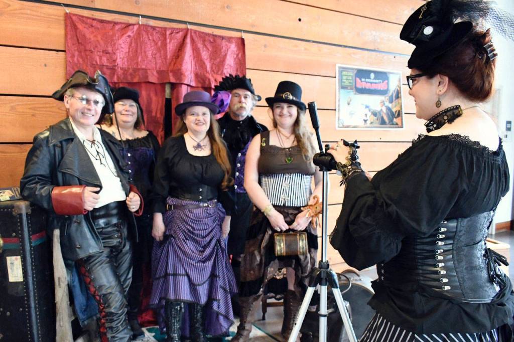 PORT TOWNSEND — Enjoying the Brass Screw Confederacy festivities in full regalia on Friday are, from left, Josh Putnam of Pacific, Kathleen Wilson-Brumangin of Clallam Bay, Koralee Putnam of Pacific, Scott Brumagin of Clallam Bay and Melissa Stay of Tacoma. Natalie Ainge of Port Townsend serves as portrait photographer. The three-day festival continues today.