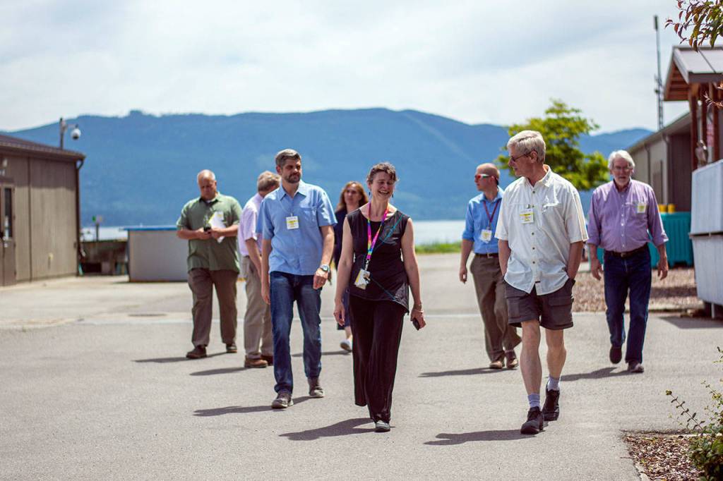 Genevra Harker-Klimes, center, division director of the Pacific Northwest National Laboratory’s Marine Sciences Laboratory, leads a tour through the Sequim facility. (Jesse Major/Peninsula Daily News)