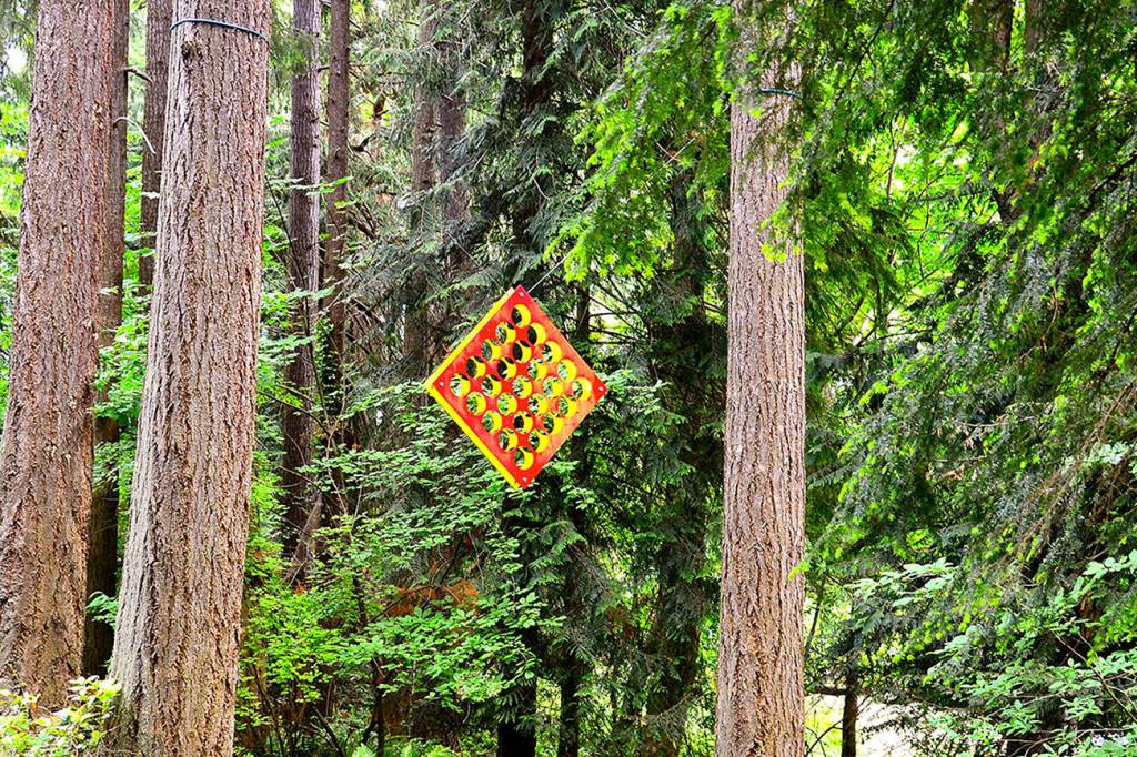Gray Lucier’s sculpture catches the light in Webster’s Woods. (Diane Urbani de la Paz/for Peninsula Daily News)