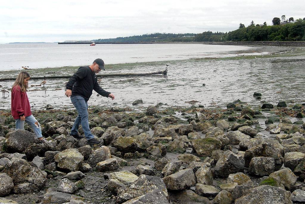 PORT ANGELES — Adrian Acosta of Hullsboro, Ore., and his daughter, Arien Acosta, 15, make their way over normally submerged rocks at Hollywood Beach in Port Angeles during low tide. Thursday’s -2.8-foot tide was among the lowest of the year at Port Angeles Harbor.