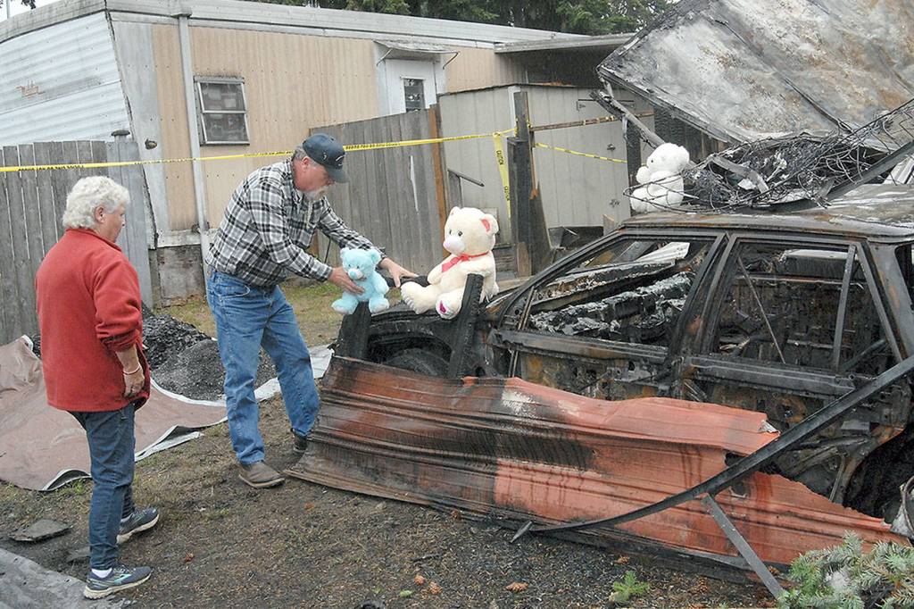Jack Hutto of Port Angeles, father of Valerie Kambeitz and grandfather to Lilly, Emma and Jayden, placed teddy bears that belonged to his grandchildren next to the burned mobile home.